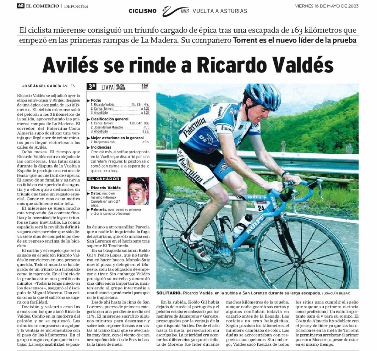 En la tercera etapa, Gijón-Avilés, Ricardo Valdés ataca en el kilómetro 3 de la etapa, aquella con los puertos de La Madera, Tenebreo y San Lorenzo, el gran estreno, por delante, y se planta en solitario en la meta de Aviles, tras más de de 160 kilómetros de fuga.