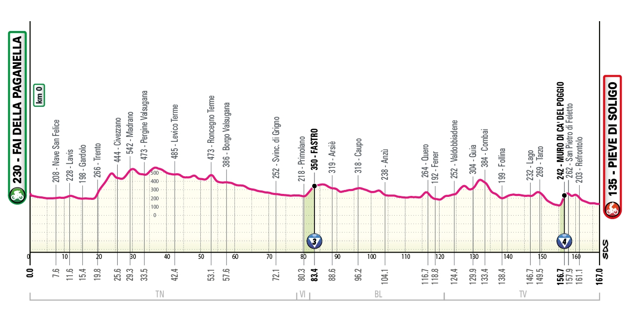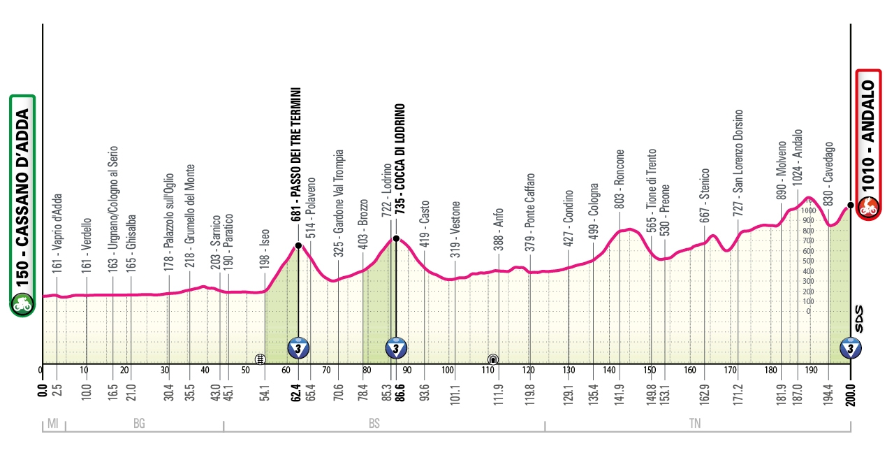 ETAPA 17 (miércoles 27 de mayo de 2026): antes de la "traca final" se vienen dos etapas que parecen destinadas a las escapadas. La primera de ellas cuenta con 200 kilómetros y remate en la subida a Andalo (de tercera categoría).