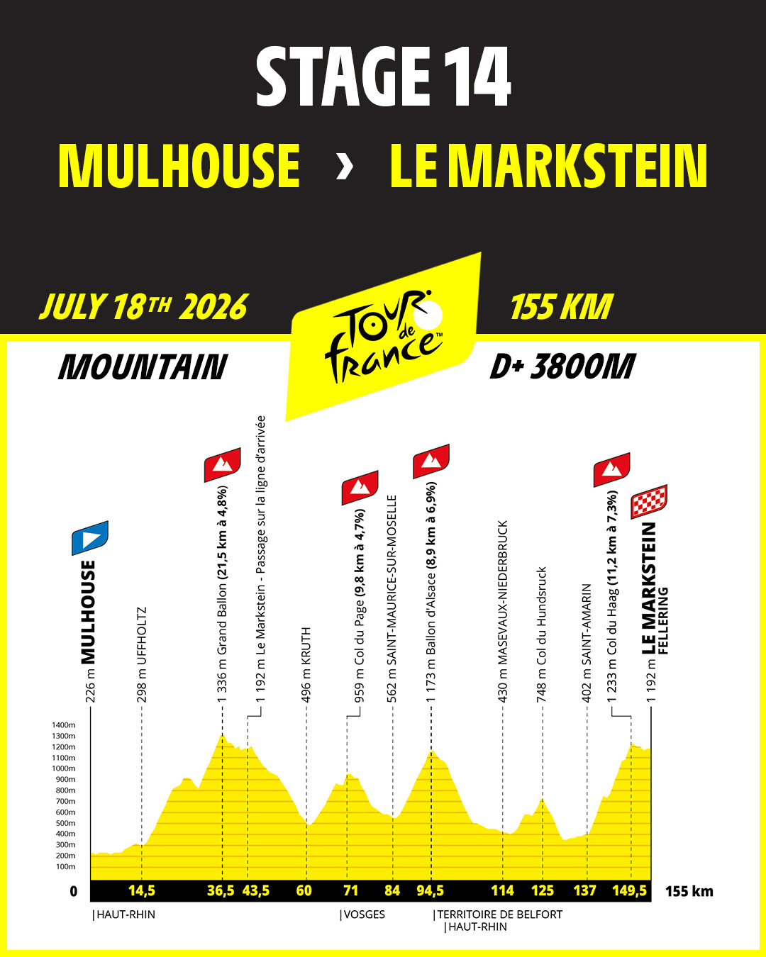 | 14 | Mulhouse-Le Markstein | 155 kms | 3800 m | Montaña | 18/07/26 |