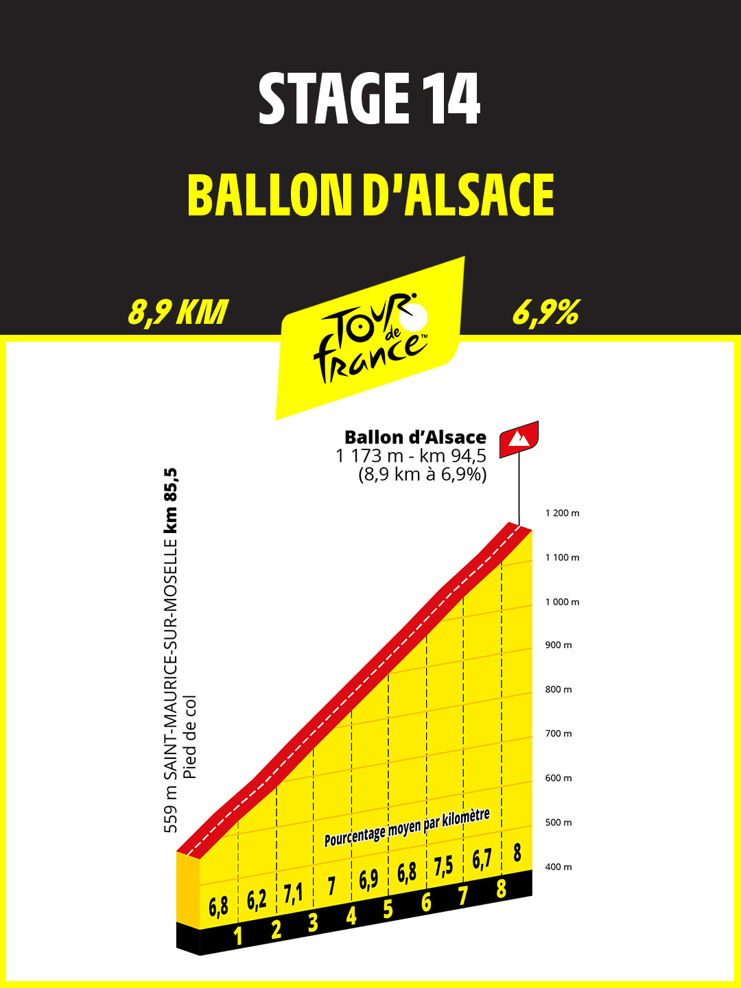 ETAPA 13: El Tour se interna en Los Vosgos con esta llegada a Belfort previo paso por el Ballon D'Alsace a poco de meta (Atención, la etapa más larga del Tour, con 205 kilómetros).