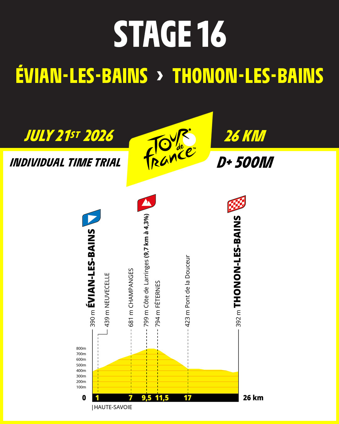 | 16 | Evian Les Bains-Thonon Les Bains | 26 kms | 500 m | CRI | 21/07/26 |