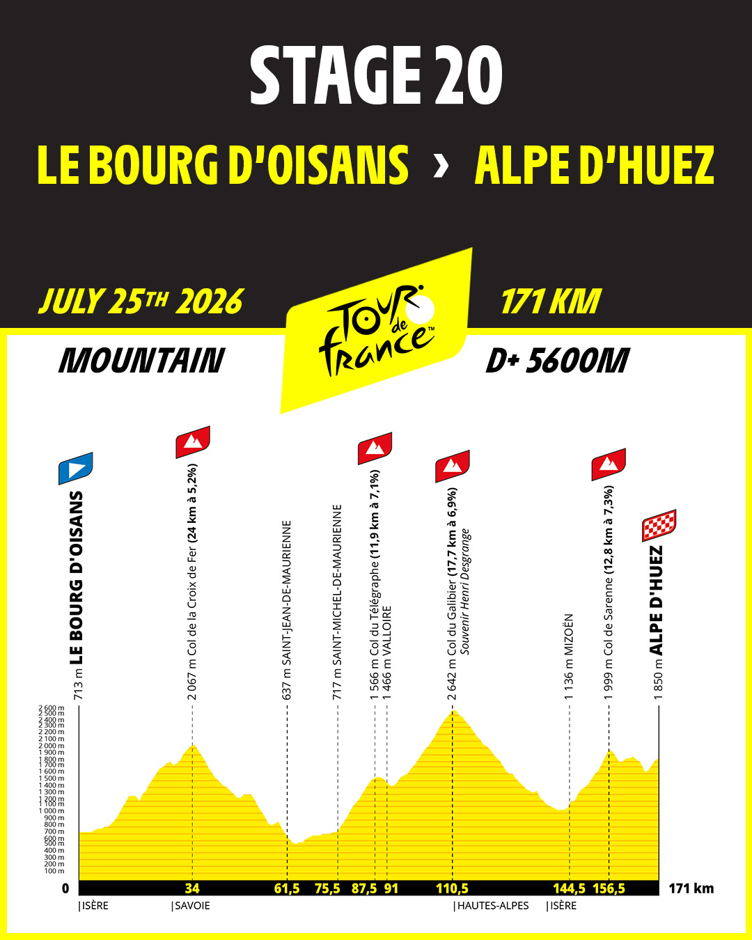 | 20 | Le Bourg D’Oisans-Alpe D’Huez | 171 kms | 5600 m | Montaña | 25/07/26 |