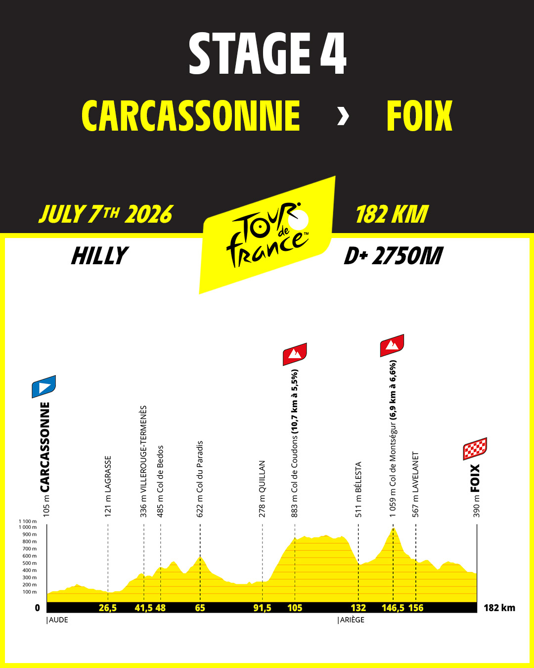 | 4 | Carcasonne-Foix | 182 kms | 2750 m | Media Montaña | 07/07/26 |