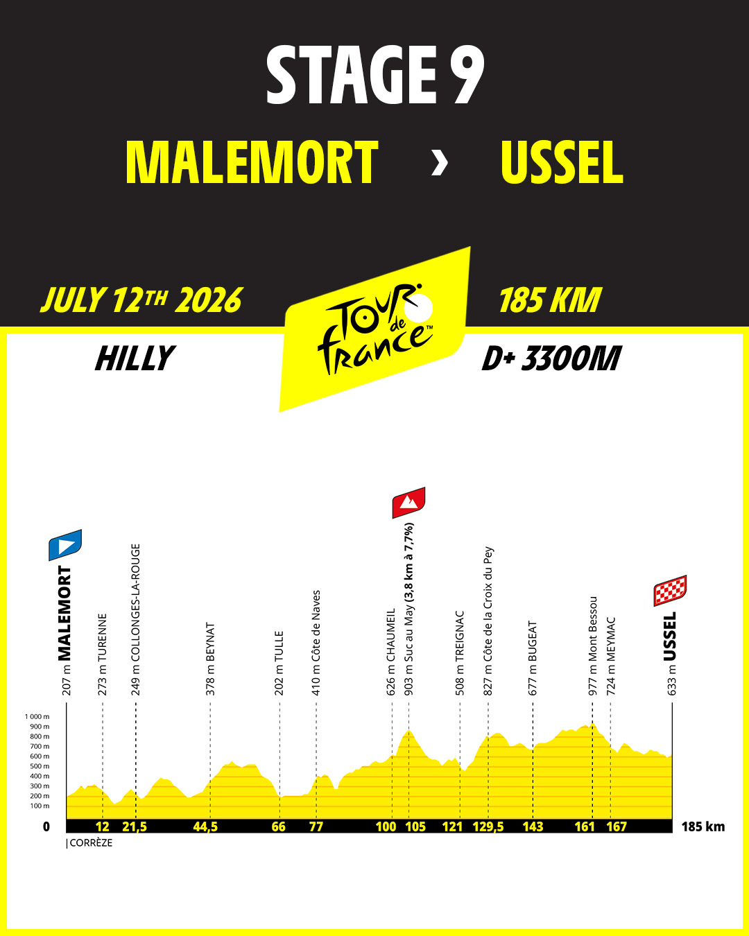 | 9 | Malemort-Ussel | 185 kms | 3300m | Media Montaña | 12/07/26 |