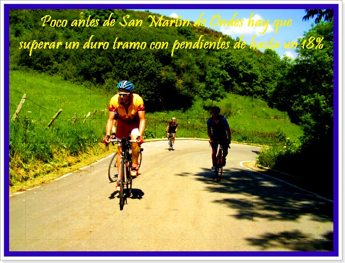 Y llegamos al primer tramo de consideración, cuando dejamos a un lado Ondes y la pendiente crece y crece y crece hasta alcanzar un 18%. En pleno sufrimiento empiezas a cuestionar al ingeniero que diseñó la carretera: en lugar de meter un par de curvas y rebajar la pendiente, la carretera se empina para buscar San Martín de Ondes. Mejor así, sin duda. El paso por este pueblo nos da la posibilidad de respirar tras el sofocón anterior y recargarnos con vistas al peor tramo del puerto, el que une San Martín con la cima de la Corredoria. Un nuevo estrechamiento, un súbito aumento de la pendiente, una nueva herradura, una nueva recta a la que no se le ve el final... Durante varios cientos de metros las pendientes se escriben con dos dígitos. En nuestro pedaleo casi atolondrado, mareado, acertamos a ver San Martín de Ondes muy, muy, muy abajo. "Pero si he estado ahí hace nada...".