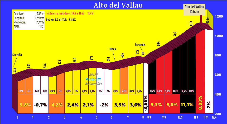 Ascensión situada en el concejo de Cangas del Narcea y que bien puede ser utilizada como vertiente del puerto de Leitariegos, puesto que entronca con la carretera principal cuando quedan unos 10 kilómetros para la cima. La subida al alto del Vallau cuenta con un tramo de aproximación más bien largo (hemos situado el inicio en Carvallo, de donde bajará la vertiente del Santuario del Acebo proveniente de las Tiendas). Y así hasta Sonande tendremos algo más de ocho kilómetros plenos de "toboganes" que nos adentran en el valle en busca de la dureza  de esos poco más de tres kilómetros...