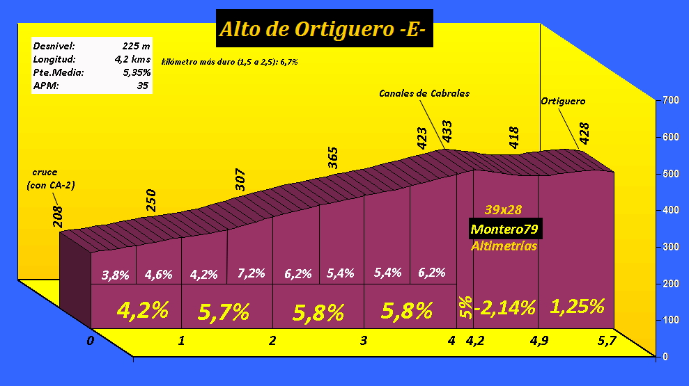 El alto de Ortiguero por su cara este se utilizó durante varios años en la Vuelta a España, precediendo a los Lagos de Covadonga y tras "los tres collados", en Cantabria: Carmona, Ozalba y la Hoz. Fue el intento de endurecer la habitual etapa reina de la carrera con otra alternativa al Fito, pero Ortiguero, como veis aquí, dista mucho, en dureza, de aquel... Ascensión con tres vertientes, la norte (que asciende por la Rebollada, como también se la conoce) la vimos aquí hace unas semanas y será utilizada en la Vuelta 2015 antes del Jitu (Sotres), bajando, posteriormente por aquí, en dirección a Arenas de Cabrales.