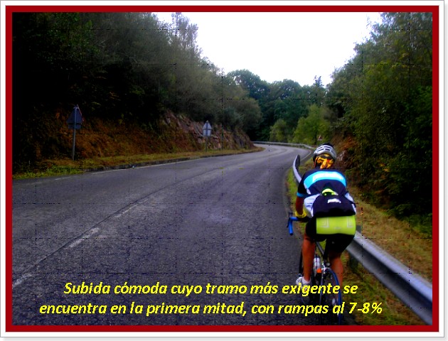 Comenzamos la subida a la altura de Meré, en el concejo de Llanes, en la carretera AS-115, si bien ya tendremos una leve tendencia ascendente desde más al norte. El inicio es precioso, encajonado, lo que le da sensación del gran puerto que no es. Cuenta con un tramo intermedio duro (tampoco exageremos) en donde las pendientes rondan el 7-8%, si bien la tónica de la subida serán rampas más suaves, que convierten a este pequeño paso en bastante cómodo. Tras poco más de 5 kilómetros alcanzamos una rotonda a la altura de la Robellada (el alto de la Robellada), pudiendo girar a la derecha, hacia Benia de Onís y Mestas de Con (en bajada), o continuar subiendo, a la izquierda, hacia Ortiguero (el alto de Ortiguero). En esta ocasión optamos por esta segunda opción, prolongándose la ascensión durante algo más de un kilómetro, hasta que coronamos a 432 metros.