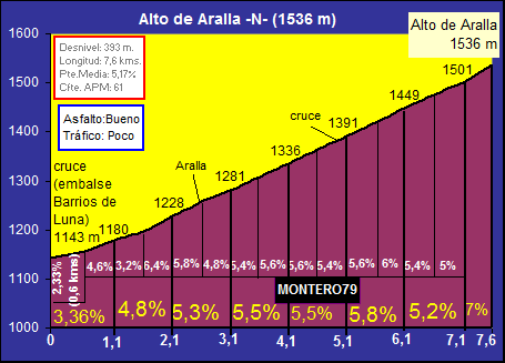 Esta es la altimetría del puerto de Aralla por su cara norte, la que comienza en las estribaciones del embalse de Barrios de Luna. La subida transcurre por una carretera que está en bastante buen estado y que, por lo general, tiene poco tráfico. Las pendientes de este puerto son muy continuas, no teniendo zonas extremas, y situándose en torno al 5-6%. El tramo más duro de la subida coincide con el paso por el pueblo de Aralla y, sobre todo, la parte final en donde alcanza el 7%.