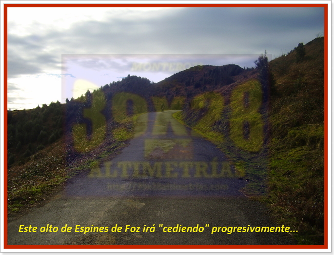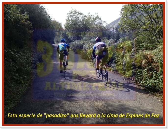 Una bajadita de un kilómetro nos permite "aterrizar" en el concejo del "Olimpo del ciclismo". No os voy a decir que huele a ciclismo y a coloso y a todo lo demás, porque eso sólo se huele si te diriges a Grandiella y Viapará y un "poco" más arriba, pero en esta ocasión nuestra cobardía nos hará "huir" por la carretera que se dirige al Cordal, ascensión liviana, agradable, cicloturista en su máxima esencia: vistas imponentes, ausencia de rampones, poco tráfico, carretera de montaña. El Cordal por Riosa, quizá el puerto más infravalorado del cicloturismo asturiano, de forma absolutamente injusta, pero sigamos pedaleando hasta llegar a su cumbre, donde se divisa... TODO, que no es poco. Cien metros más allá (posiblemente sean 80 o 90 o 120, pero, como os ya dije más arriba, el que quiera sólo números que busque en otro lado) tomamos un desvío a la derecha y sigue el espectáculo, el del alto de Espines de Foz, o Cuchu Puercu, como suelen decir en la prensa. Algo más de seis irregulares kilómetros que transcurren a golpe de rampón y descanso. Rampas, herraduras, carretera estrecha, baches, vistas increibles.