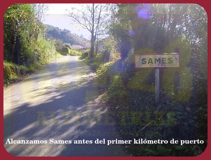 Transcurriendo por la carretera nacional N-625, de Cangas de Onís hacia el puerto del Pontón, encontraremos , en Precendi, el desvío hacia el Mirador de la Collada, hacia Sames, hacia San Román, iniciándose, con violencia, este explosivo puerto. Las primeras rampas, hasta Sames, ya son considerables, alcanzando el 15%, y con zonas muy sostenidas de dos dígitos. Un pequeño descansillo en esta localidad (Sames) nos permitirá respirar con alivio y afrontar el tramo central de esta primera fase de la subida al collado Amieva. Casi tres kilómetros muy sostenidos en torno al 10%, con un fondo paisajístico de un nivel colosal (ver imágenes o, mejor dicho, acudir el puerto ya). La subida transcurre entre zonas más despejadas y otras más arboladas, entre rampones y brevísimos descansillos hasta Carbes, donde se suavizan las rampas y entramos en una zona más sombría con alguna que otra "herradura". Será en el quinto kilómetro donde atravesamos lo más duro de esta fase inicial, allá donde la carretera se inclina hasta un 17%. Un puerto que con estas características ya es para tomárselo muy en serio, pero que adquiere tintes verdaderamente épicos cuando afrontamos el descenso hacia San Román y observamos frente a nosotros lo que parece ser una carretera serpenteando a través de la montaña, un camino estrecho, un camino de violencia...