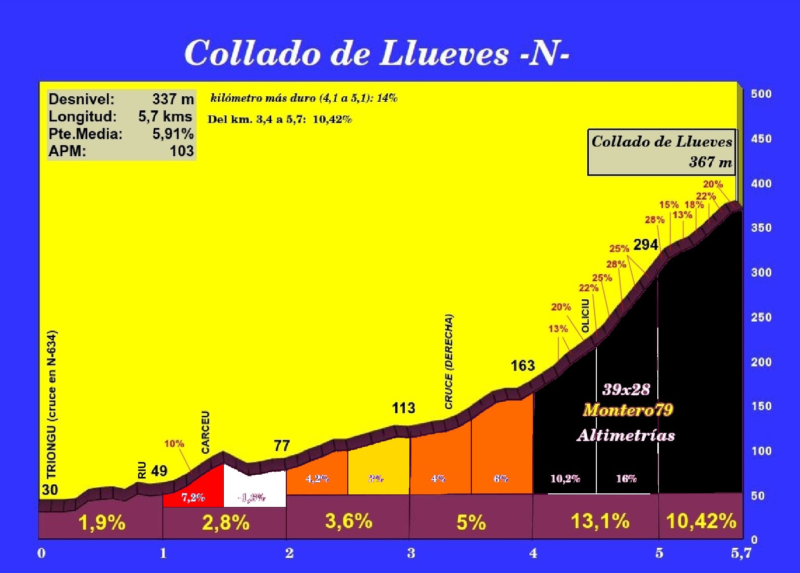 El collado de Llueves dista unos 5-6 kilómetros de Cangas de Onís y es, posiblemente, la trampa que mejor enlaza con Lagos de Covadonga. Por su cara sur es similar en cuanto a rampas y carretera (estrecha y de buen piso) con lo que bien puede incluirse en futuras etapas con final tanto en Lagos como en Cangas de Onís.
