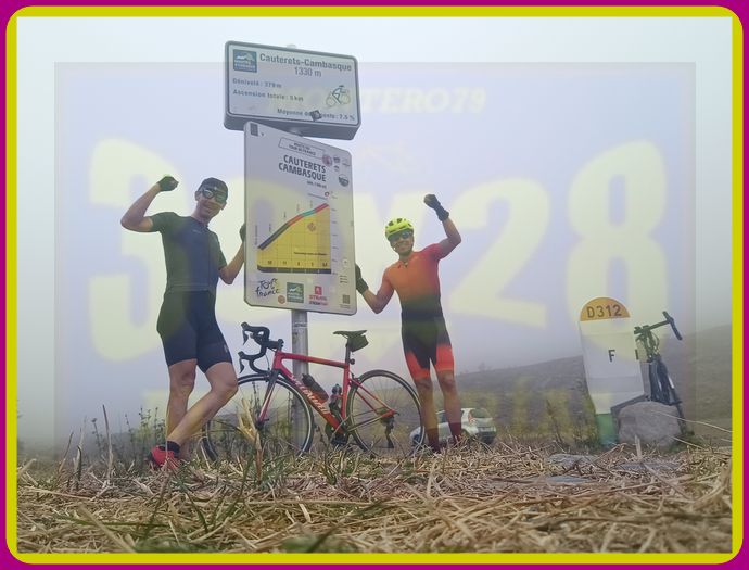Con la equipación de gala (la de la web, como no podía ser de otra manera) posamos en este cartel, en Luz Saint Sauveur, donde nos indican el col du Tourmalet, nada más y nada menos.