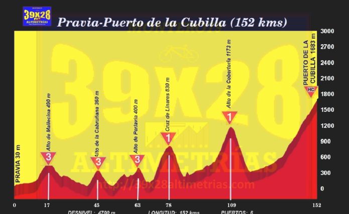 La etapa planteada combina ascensiones más o menos conocidas aunque incluídas muy a cuentagotas (Mozqueta, Cobertoria por Lena, Dosango) con otras inéditas (Cruz de Linares y Ferrerinos), alcanzando los 157 kilómetros y un desnivel de 4100 metros...