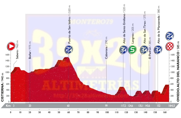 Tras entrar en Asturias, cinco cotas de montaña, con Santo Emiliano (cambio respecto a enero en que se sube desde Mieres), San Tirso (éste no estaba), Padrún (no puntúa, pero hay que subirlo), Manzaneda y el final en el Naranco.