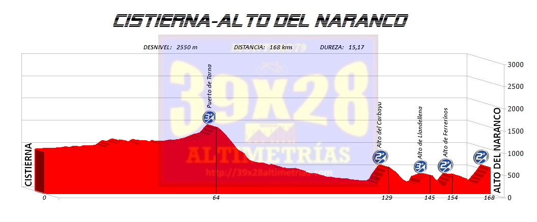 La etapa parte de la localidad leonesa de Cistierna, cerca de la cual finalizará la jornada del día anterior (en la cima del alto de la Camperona). Entrada en Asturias por el puerto de Tarna, con las reservas del estado del firme, por lo que pudiera ser que hubiera un cambio de planes (por San Isidro o Pajares), y luego el encadenado que ya es un clásico: Santo Emiliano (3ª cat)-Padrún (no puntuable)-Manzaneda (3ª cat)-Naranco (2ª cat). Será la quinta vez (tras incluirse en los años 1990, 1994, 1997 y 2013) de este enlazado, y la 14ª ocasión en que el Naranco sea meta en la Vuelta a España. El Naranco no parece gran cosa, pero recordemos que en su cima han vencido corredores de la categoría de Jose Manuel Fuente "El Tarangu", Álvaro Pino, Lale Cubino, Tony Rominger, Laurent Jalabert o Joaquim Rodríguez.