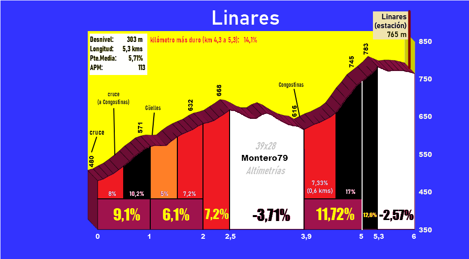 Fuera de las subidas a los puertos que existen en el concejo de Lena tal vez la de Linares sea la de mayor contundencia y longitud. La ascensión arranca cerca de Puente de Los Fierros, en un desvío que nos encontramos en la N-630. El inicio ya es muy duro, pues las rampas se sitúan por encima del 8-9% (el primer kilómetro llega al 9,1%). Un breve tramo de llano (y en ligerísimo descenso) nos sitúa en la localidad de Buelles (o Güelles) donde retomamos la ascensión de forma abrupta (con varias rampas por encima del 10% que no vienen indicadas en el gráfico). La primera parte de la ascensión se cierra tras poco más de dos kilómetros y medio, muy cerca de un repetidor, y donde las vistas son francamente espectaculares. Se abre ahora una zona que combina descensos abruptos con tramos de subida realmente duros, hasta llegar poco antes de llegar a Congostinas. Esta zona transcurre por una zona arbolada y por un asfalto en un estado irregular (abril 2024). Y entramos en la fase decisiva de la subida, la más dura, cuando abandonamos esta localidad de Congostinas para dirigirnos de forma irremediable hacia Linares. Lo que nos vamos a encontrar ahora poco tiene que ver con lo visto hasta entonces. Así, vamos pedaleando como buenamente podemos, a través de un tramo hormigonado con pendientes que alcanzan el 20% y descansos al 11-12%. La dureza en este kilómetro definitivo de ascenso está fuera de toda duda, con varias curvas de herradura y una zona final de asfalto (reciente) que nos lleva a coronar un pequeño altillo previo a la llegada a Linares (más en concreto, a la estación o apeadero).El coeficiente APM de 120 ya lo dice todo (el alto del Cordal tiene 150, por ejemplo), aunque conviene tener en cuenta también el kilómetro a más del 14%, las rampas al 20%, el tramo hormigonado,… Un auténtico desafío para cualquier cicloturista, el cual se verá recompensado por unas vistas más que espectaculares desde distintos tramos de la subida.