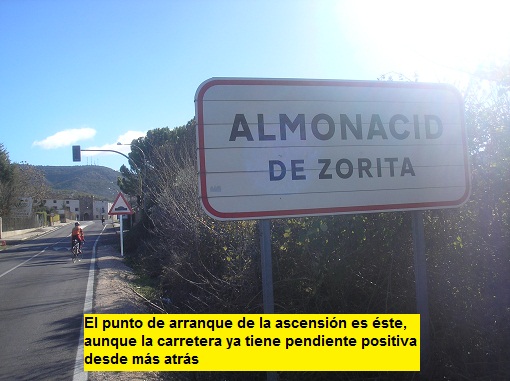 Situamos el inicio de la subida en la localidad de Almonacid de Zorita, aunque la carretera ya lleva pendiente positiva desde más atrás. Son unos pocos metros de desnivel que no inciden sobremanera (las pendientes son al 1-2%). La primera parte transcurre por una carretera impecable que une las localidades de Almonacid de Zorita con Albalate de Zorita. Las rampas aquí ya nos sirven para un calentamiento en vistas a lo que se nos viene encima en la segunda parte, que poco tiene que ver. El paso por Albalate es prácticamente llano, lo que le resta continuidad a la ascensión (algo más de un kilómetro de pendiente casi nula). Retomamos el ascenso poco a poco a la salida del pueblo (muy levemente), proceso que se interrumpe bruscamente cuando llegamos al desvío hacia la Nueva Sierra Madrileña... No, Canencia, Morcuera o Cotos no se han venido más al sur, sino que es el nombre de la urbanización en la que nos adentraremos en busca del Mirador de Cuenca.