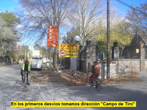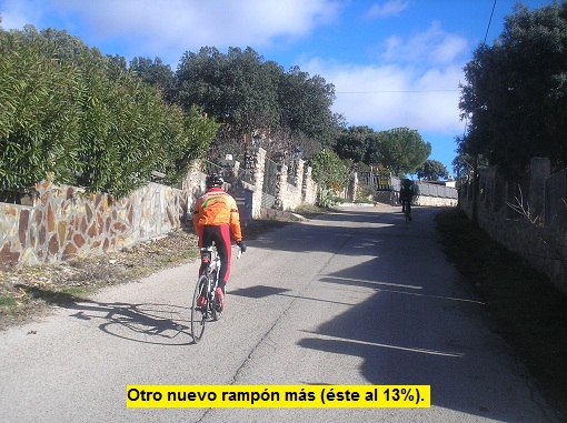 Y cambio de decoración completo. La pendiente se va incrementando tras pasar la barrera (previo saludo al guardia que nos mira con cara de "¡preparaos!"). 10, 11, 12, 14, 18%... Te retuerces sobre la bicicleta e intentas recordar dónde estás. ¿No decían que aquí no había grandes subidas? Un kilómetro más adelante tomamos el primero de los sucesivos desvíos hacia el campo de tiro, que nos irá guiando hacia nuestra meta, que no es otra que el Mirador de Cuenca. Ahora se suceden los rampones de forma eléctrica, como una broma pesada en la que cada tramo en que atisbamos un respiro, más adelante se esconde un tramo con pendiente de doble dígito. Y en subidas así las piernas se quejan, vaya si se quejan, por no poder adivinar la cadencia precisa que necesitamos para vencerla. Un poco de llano, rampón, nuevamente llano, rampón, bajada brusca, más rampón... Pasado el campo de tiro tomamos un desvío a la derecha, estrecho (está en foto), cuando llevamos algo más de 8 kilómetros. Y afrontamos, casi con miedo, la parte final, porque parece que la cima aún está muy arriba... Nueva sucesión de toboganes, más bruscos, rampas al 15-16%, descenso, y 500 metros de apoteosis en los que las pendientes llegan al 22% (200 metros al 20%). La última parte es terrible, pero el esfuerzo vale la pena para contemplar desde la cima Cuenca, Guadalajara. Es el Mirador de Cuenca, con unos números globales que tal vez no digan gran cosa, pero que al detalle hablan de una dura subida, otra más, de la sierra de Altomira.