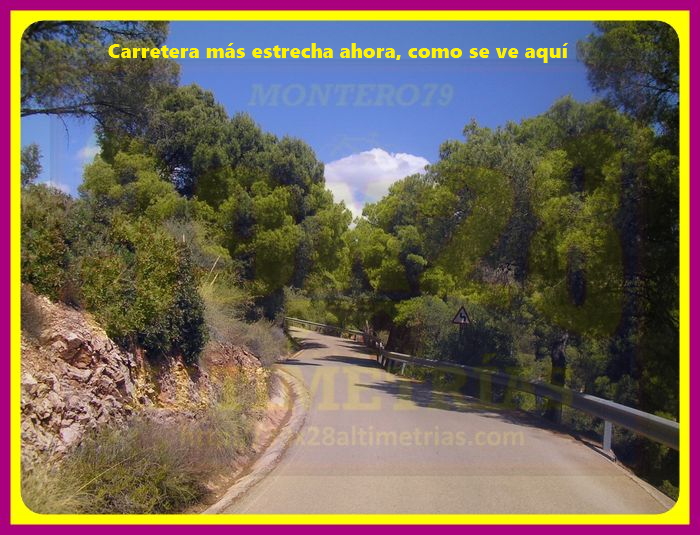 Pero vayamos por el principio. Arrancamos la subida a la salida de Totana, en la confluencia de las carreteras C-8 y RM-502, y los primeros kilómetros irán en progresión (de dureza) por una carretera más bien ancha. Y todo hasta pasado el sexto kilómetro, en donde a la altura de La Santa giramos a la derecha por una carretera mucho más estrecha, con algún que otro tobogán, alguna que otra rampa de consideración. Será una especie de atajo (sobre 2 kilómetros) que añade más interés a la subida (que también se puede afrontar por Aledo, claro). Seguidamente saldremos a la carretera principal, aunque ya con un asfalto más rugoso, un aspecto más de montaña, y en el kilómetro 10 tomaremos el definitivo desvío al collado Bermejo y el Morrón de Espuña. La subida se adentra en la sierra, primero con un largo tramo recto, bastante arbolado, con una pendiente muy sostenida en torno al 8-9%, lo cual se mantiene durante unos dos kilómetros: hasta el área recreativa de las Alquerías, paradisiaco lugar en el que vemos, frente a nosotros, la tremenda mole del Morrón de Espuña...si no nos la tapan los árboles, claro. La subida a partir de aquí se convierte en una sucesión de herraduras y la dureza se incrementa sobremanera. ¿Buscais puertos con múltiples herraduras? ¿Aún seguís embobados con Casielles y el famoso Lacets de Montvernier que mostró el Tour hace ya unos años? Pues aquí tenéis uno que va sobrado de curvas y curvas, que no tuve más remedio que retratar y retratar. Y si no encontrais el ángulo adecuado ahí está el mirador del collado Pilón para contemplar la grandeza de lo que va de ascensión. Herradura tras herradura nos servirá para alcanzar el puerto, el collado Bermejo, cercano a los 1200 metros de altitud, y de donde sale la carretera que sube al Morrón de Espuña (de Sierra Espuña). Carretera en buen estado, con rampas, digamos, "dubitativas" en principio, más despejado que el ascenso hasta el collado, y que nos deja ver la otra vertiente, la de Alhama, que se pierde en la inmensidad (más larga todavía), la dureza irá "in crescendo" y el "EVA 13" y el Morrón se irán acercando más y más, pero muy lentamente, porque las rampas más duras, ya de dos dígitos, se suceden en esta fase final de la subida. Al mismo tiempo algunos carteles comienzan a avisarnos de la entrada en la base militar y que "está prohibido el paso", lo que se concreta en una curva de herradura (una más), a más de 1510 metros de altitud, y a menos de un kilómetro de la verdadera cima.