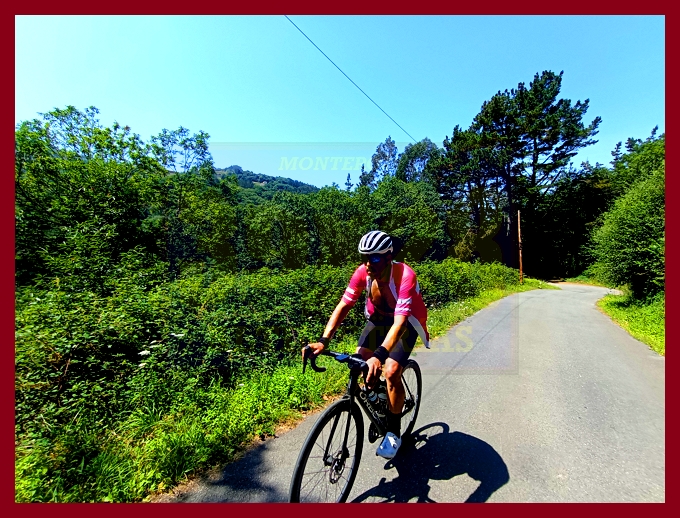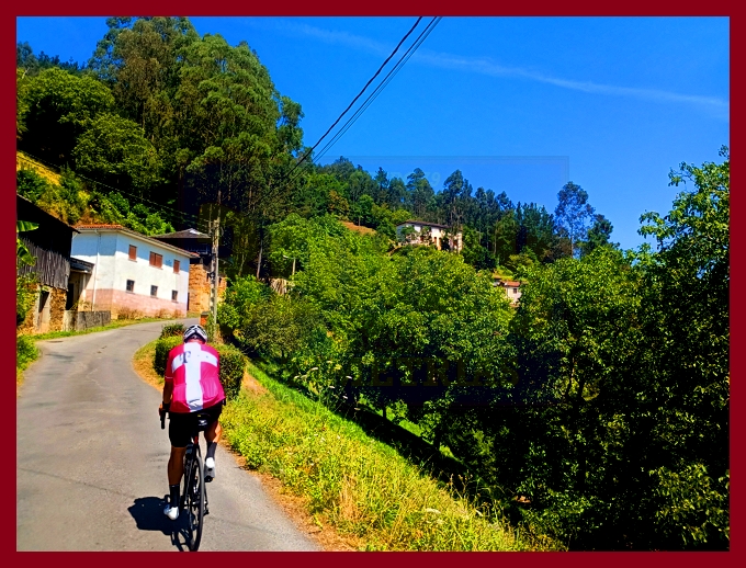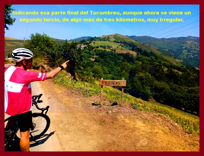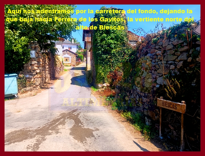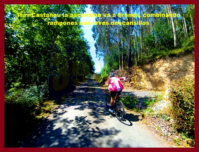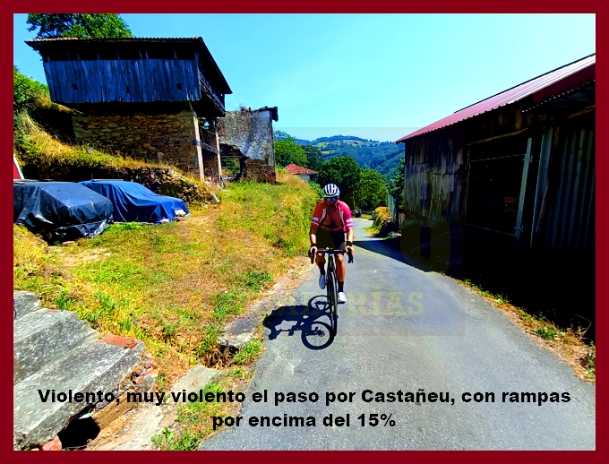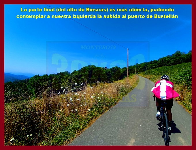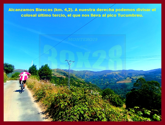 Comenzamos la ascensión en un cruce situado en la carretera N-634 (la carretera del puerto de la Espina, en otros tiempos no tan lejanos plagada de tráfico, pues era la vía principal de comunicación del centro de Asturias con su ala occidental y Galicia). En ese mismo punto hemos de señalar que arrancan otras dos ascensiones que aquí (en esta web) también están recogidas: el puerto de la Espina y el alto de Aguión por Lavio. La arrancada del puerto, por una carretera bastante estrecha y en relativo buen estado (a pesar de que con la primera foto usted pueda pensar lo contrario), es realmente violenta, con rampas ya de dos dígitos, varias curvas de herradura y el pueblo de Castañeu situado en mitad de uno de esos "chepazos" que tendrás que dar al principio. El alto de Biescas, que es esta primera parte, es uno de esos puertos que, cómo no, permanecen inéditos en la competición profesional, a pesar de contar con números y enlazados absolutamente impresionantes: junto a esta carretera, al otro lado de la N-634, transcurre el puerto de Bustellán, nada más y nada menos.