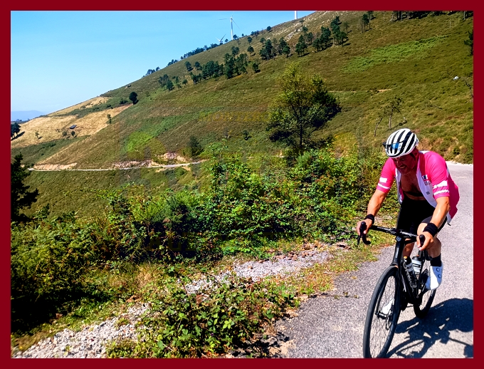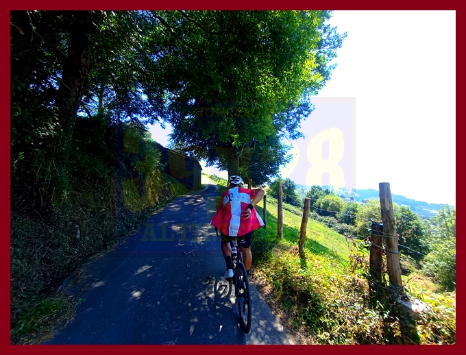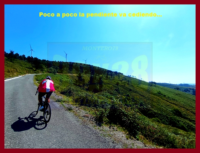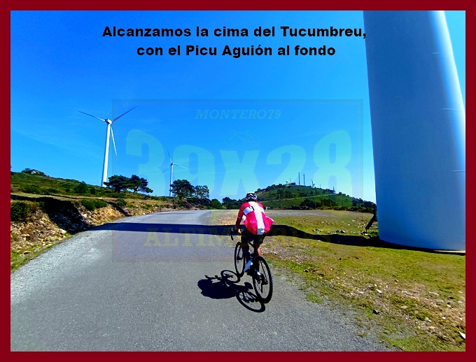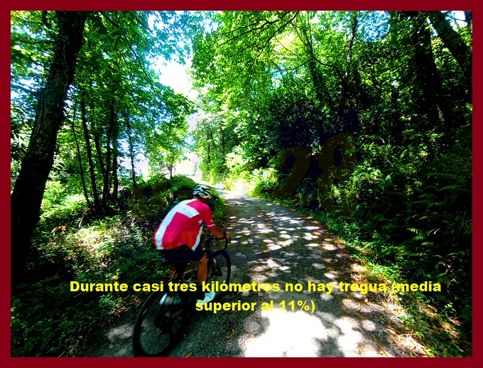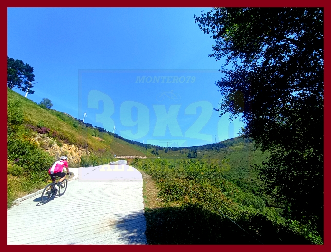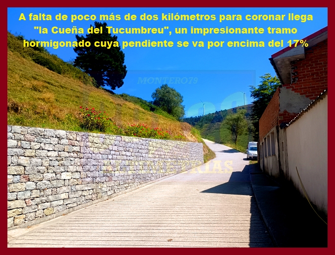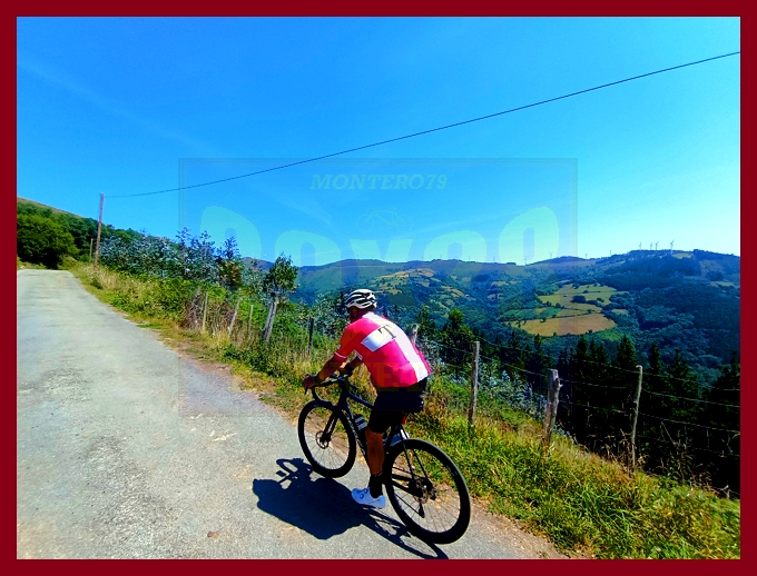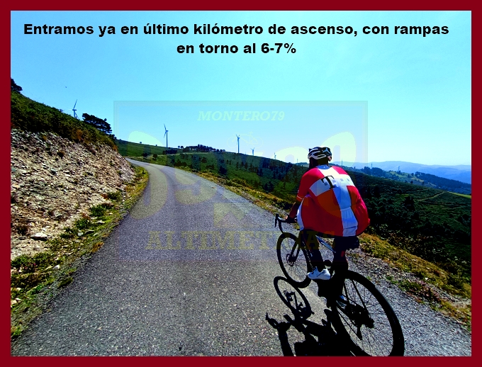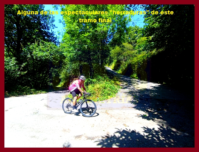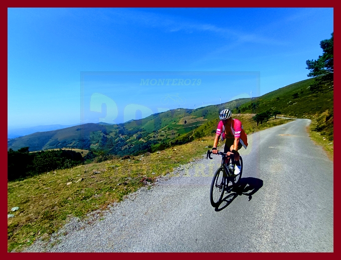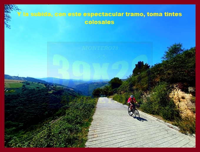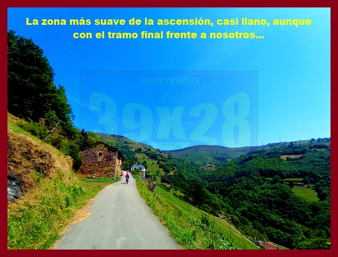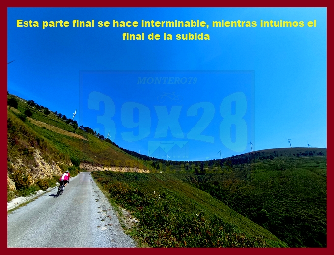 Entramos ahora en una fase muy irregular, con un abrupto descenso, en principio, y pequeños toboganes que sirven para no "enfriar" en demasía las piernas antes del cruce del kilómetro 7,9, lugar en el que dejamos la carretera de Pende (que conecta luego con Lavio). A partir de este punto, y durante casi tres kilómetros la dureza se mostrará en todo su esplendor, encontrando su clímax en una recta en un principio hormigonada, luego ya asfaltada, en donde las pendientes rondan el 20%: un tramo que recuerda, a su manera, a una Cueña (y ahí tenéis las fotografías). Tras este espectacular rampón la pendiente decae por momentos para volver a endurecerse en un kilómetro final de pendientes ya no tan fuertes (6-7%). La cima, monumental, es un auténtico mirador sobre el occidente de Asturias, con el cercano e imponente Picu Aguión frente a nosotros.