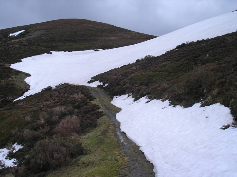 En la última parte, sin embargo, nos encontramos con otra dificultad, y es que la pista se encuentra bastante rota debido a la crudeza del invierno (en la época en que he pasado aún hay bastante nieve que ocupa la misma). Por ello la medición del último tramo (los últimos 300-400 metros) está estimada, puesto que tuve pasar entre un sendero por encima de la pista, aunque no dista mucho de la real.