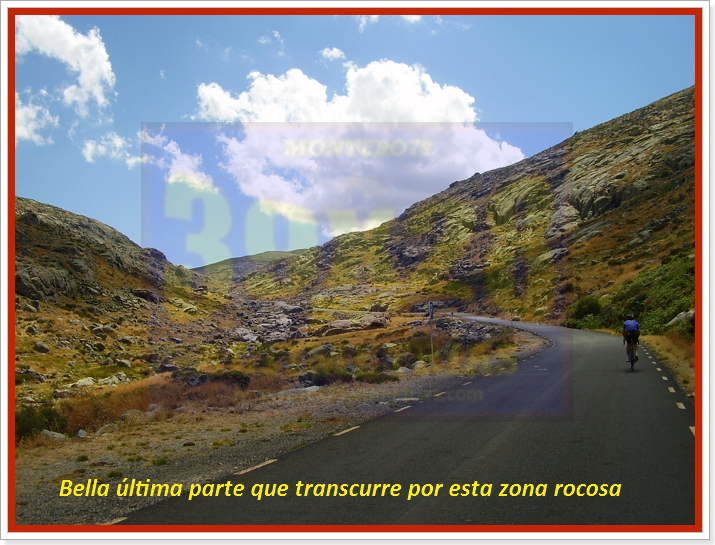 Primera fase, hasta el cruce, de algo más de 7 kilómetros, muy irregular, con constantes toboganes, rampas que llegan hasta el 17%, combinadas con fuertes descensos, y todo ello por una carretera serpenteante, revirada, encajonada en la garganta del río Barbellido. Rectas, rampones, bajadas, zona muy seca, sin árboles,... Así es esta primera parte, hasta que alcanzamos la barrera (disculpad no haber puesto ninguna foto del cruce, al que se llega tras superar un paso canadiense), cambiando la decoración, puesto que la carretera irá adentrándose en una zona rocosa, en las "entrañas" de la sierra de Gredos, y la pendiente se volverá más regular (como bien se ve en el perfil).