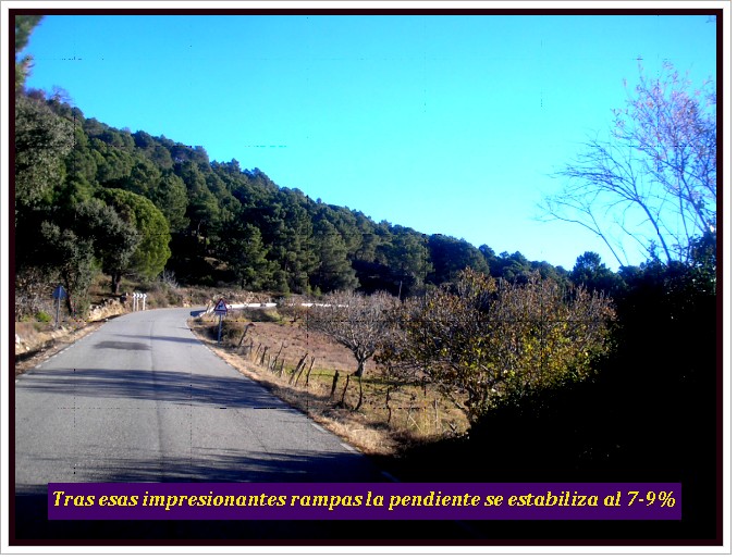 El tramo de tierra, tras esos poco más de 8 kilómetros tan irregulares continuan con la misma tónica, sucediéndose zonas realmente duras con pendientes de hasta un 14-15%, con algún descansillo que servirá para que la media se nos muestre algo más que engañosa.  Más cerrado aún en esa parte final de tierra, con una pista bastante rota, con varias zanjas que dificultan nuestras pedaladas, nuestro tránsito, tratando de buscar la trazada más limpia.