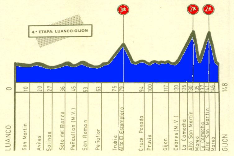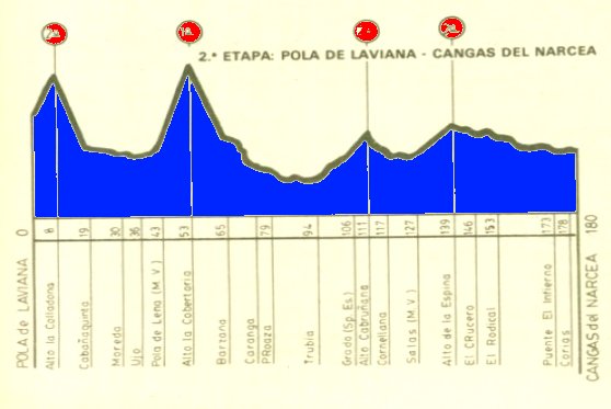 ETAPA 2: La segunda etapa se dirige al occidente con un duro recorrido. Se asciende de salida la Collaona, luego la Cobertoria (por Pola de Lena) y después la Cabruñana y la Espina, ya más cerca de la meta de Cangas del Narcea.
