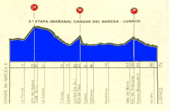 ETAPA 3: La tercera etapa cuenta con 174 kilómetros y tres puertos (Rodical, El Faro y el Praviano), llevando a los ciclistas de Cangas del Narcea a Luanco.