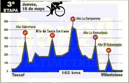 ETAPA 3: La tercera etapa es todo un "campo de minas" ya que se suben Cabruñana, Santo Emiliano, la Camperona, la Encrucijada y el Gobernador antes del final en Villaviciosa.