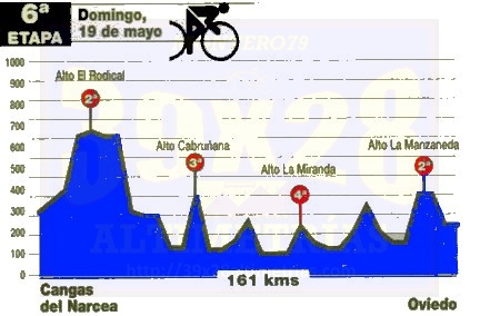 ETAPA 6: Etapa final bastante quebrada entre Cangas del Narcea y Oviedo. Se pasan El Rodical, la Cabruñana, la Miranda y la Manzaneda.