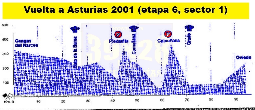 ETAPA 6: Doble sector en la última jornada. En el primero, etapa quebrada camino de Oviedo y en donde se ascienden Piedrafita y Cabruñana. En el segundo, cronoescalada al alto del Naranco.